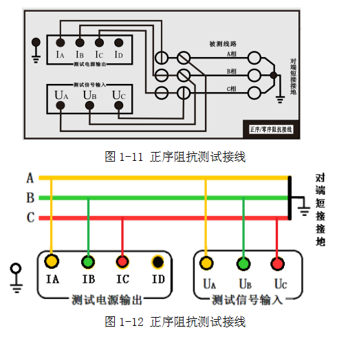 進(jìn)行正序阻抗測(cè)試時(shí),將對(duì)端短接后接地,本端分接A、B、C三相,如圖1-11和1-12。