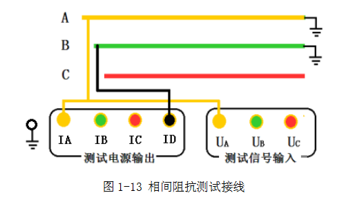 相間阻抗測(cè)試時(shí),例如測(cè)量線路A相和B相間的阻抗: